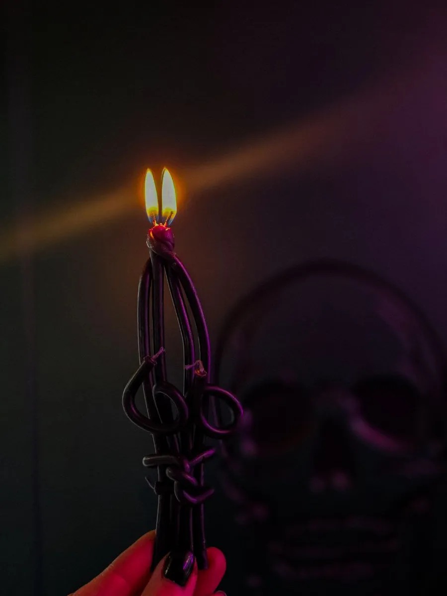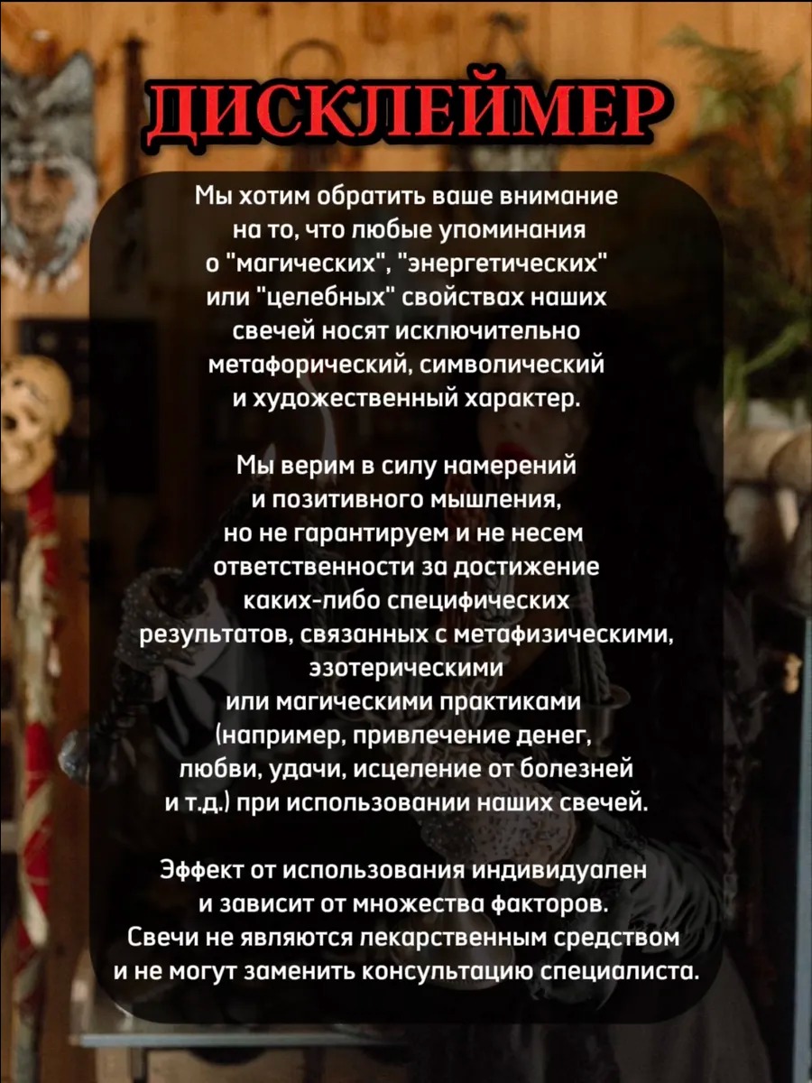 Ведьмины Кружева. Свеча Разоблачения и Защиты В таинственном мерцании свечи "Ведьмины Кружева" сплетаются древние чары, оберегающие от зла и раскрывающие тайны. Черный воск, изящно переплетенный в замысловатый узор, напоминающий тончайшее кружево, хранит в себе силу , готовую прийти на помощь тому, кто ищет защиты и правды. Эта свеча — верный союзник для тех, кто хочет: ⦁ Разоблачить скрытых врагов. Пламя "Ведьминых Кружев" пронзает пелену лжи, выявляя недругов и завистников, скрывающихся под маской дружбы. Оно поможет увидеть истинное лицо тех, кто плетет интриги за вашей спиной, будь то коварные соперницы или лживые подруги. ⦁ Защититься от негативной энергии. Сложный узор свечи, словно магический щит, отражает злые чары, проклятия и сглаз. "Ведьмины Кружева" создают защитный барьер вокруг вас, оберегая от темных сил и негативного воздействия. ⦁ Усилить интуицию. Мерцающий свет свечи пробуждает внутреннее чутье, помогая распознавать обман и предвидеть опасность.